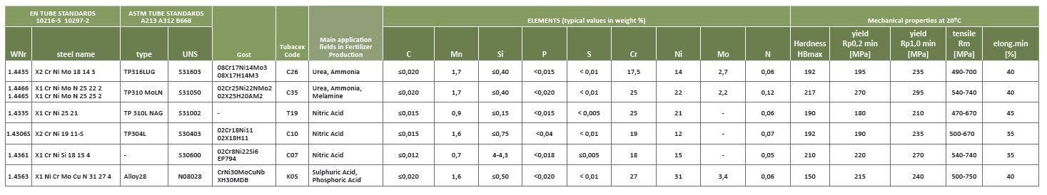In our Special Tube Mill we manufacture seamless tubes for fertilizer production equipment using high purity steel either produced in our Tubacex steel mill or purchased from our long-term business partners. Our quality control department supervises every step in the production process complying with the most stringent international codes and standards. We supply seamless stainless steel tubes in the most common urea grades: 316L UG (1.4435), 25.22.2 (1.4466) or S32906, as well as some other grades used in Nitric Acid for demanding acid environments or applications. Tubes of these grades have capable proven track records and are meeting the strict requirements in the operation of urea plants. The most typical applications for SBER/Tubacex tubes in the Urea field are strippers, condensers, scrubbers or HP piping.